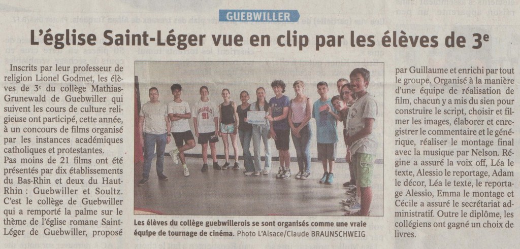 3 juillet 2022 LG DNA et l’Alsace – 3 juillet 2022 Une coquille s’est glissée dans l’article : il faut lire « élèves de 5e » et non de 3e. Film N°1 : « Saint-Léger, une église chargée d’histoire »